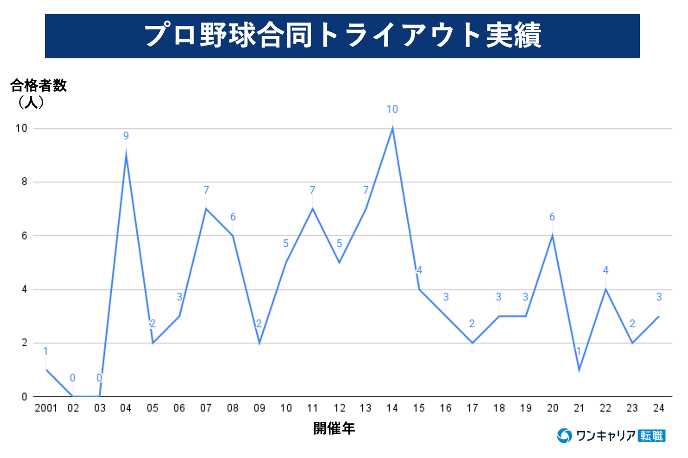 2004年には9人、2014年には10人の合格者数があったものの、過去24年の平均合格者数は4人以下となっている。特に近年はコロナ禍で二軍の試合数が少なかった2020年は6人と比較的多かったが、それ以外は3人前後で推移している。毎年50~60人程度の参加者数がいることを考えると合格率は5パーセント程度であり、いかにトライアウト経由の“再就職が”狭き門かがよく分かるだろう。