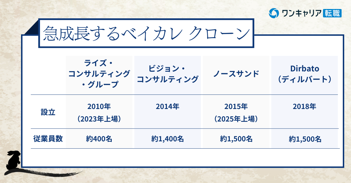 ベイカレント自体の成長はその後も順調に続き、「主要大学の就職先ランキング」などの上位常連としてもお馴染みになってきているかと思いますが、今「こんなコンサルファームが伸びているらしい」というポジションにいるのが、「ベイカレクローン」と呼ばれる新興系のファーム群です。