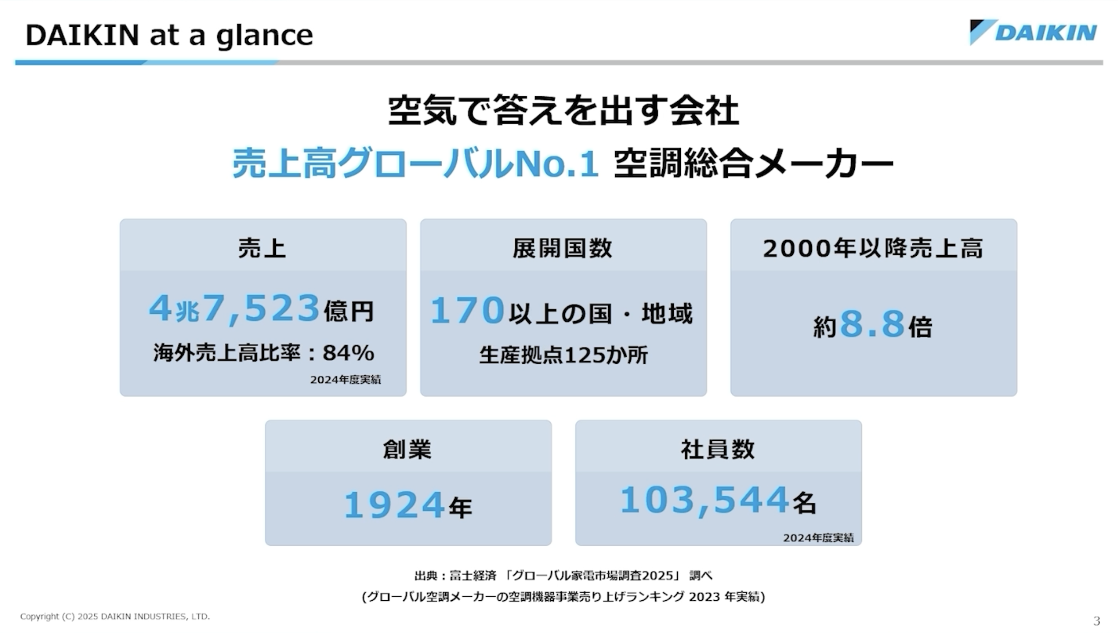 多くの日本の製造業が海外市場で苦戦する中、グローバル市場で強さを見せる「ダイキン工業」。国内では家庭用エアコンのイメージが強いが、170以上の国・地域に展開し、空調分野で世界ナンバーワンの売上を誇る。
