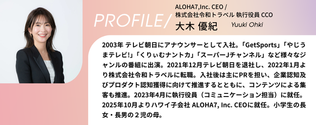 第4回のゲストは、テレビ朝日で18年半アナウンサーとして活躍後、スタートアップ令和トラベルに転職し、現在はハワイの完全子会社アロハセブンの代表を務める大木優紀さん。安定した大企業から未知のスタートアップへ、そして海外赴任までのキャリア戦略と仕事への取り組み方について、株式会社Sworkers代表/Project:F主宰の坡山里帆(以下、はやまり。)が迫ります。