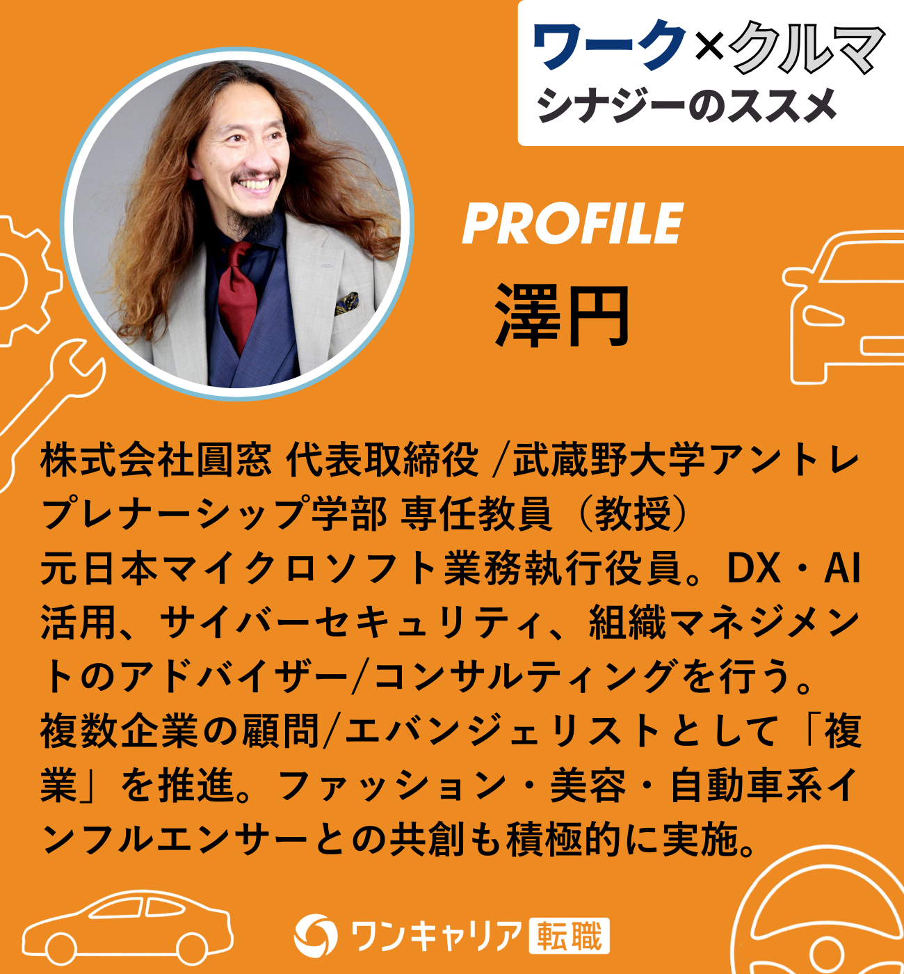 今回のテーマは「ワーク×クルマ」シナジー。ITやマネジメントの領域で活躍する澤円さんに、ビジネス、そして人生の豊かさにも繋がっているという「ボクとクルマのステキな関係」について、寄稿いただきました。