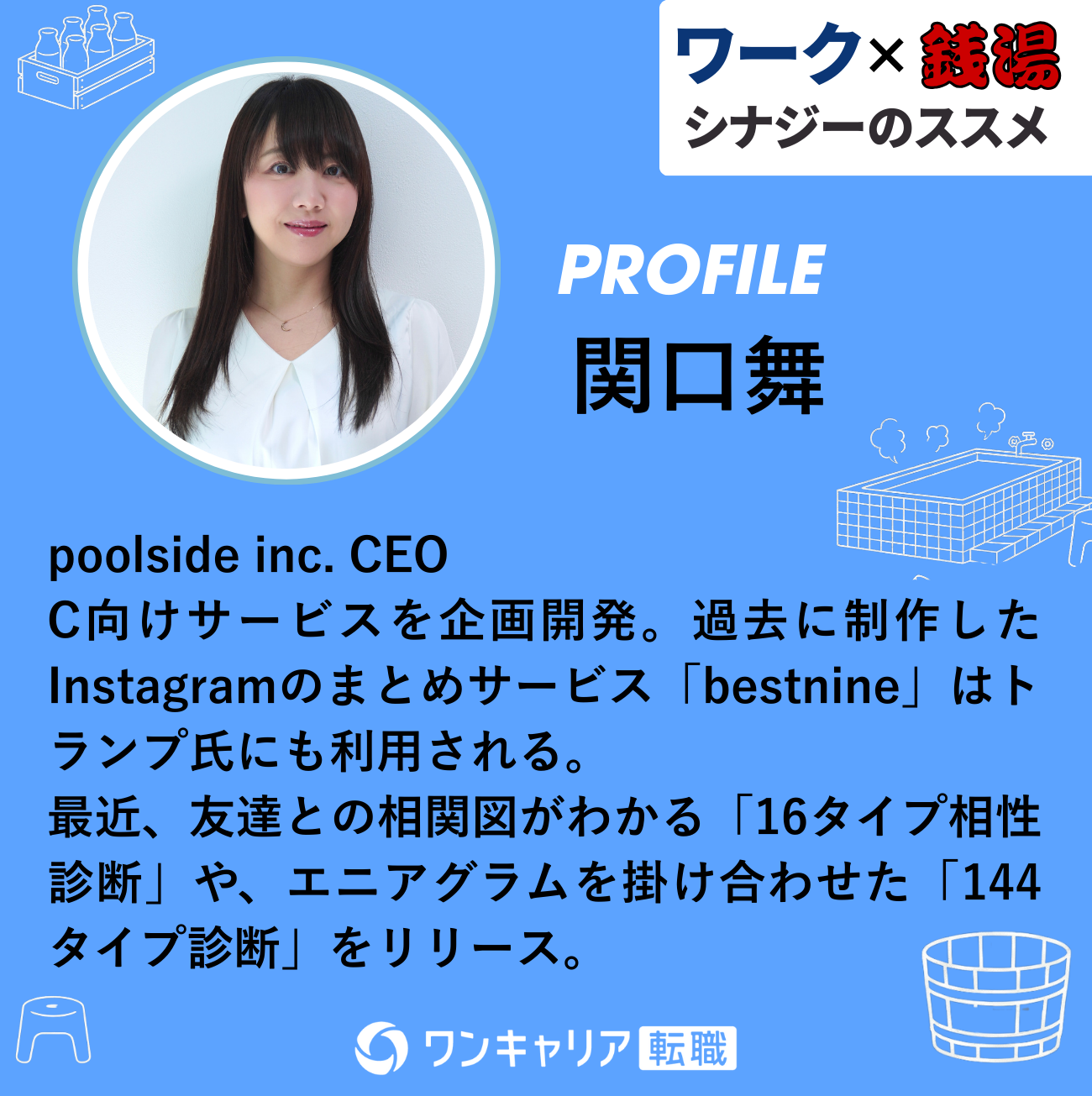仕事と趣味の相乗効果を探る本特集。「ワーク×銭湯」シナジーの前編では、poolside inc. CEOの関口舞さんに、銭湯がキャリアやサービス開発に好影響をもたらしたエピソードを紹介してもらいました。