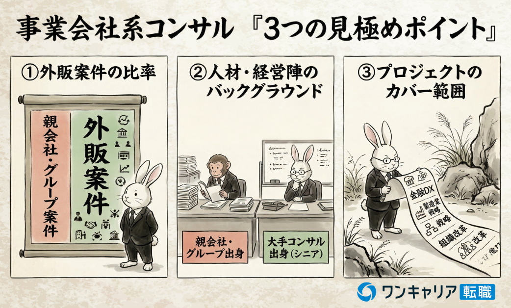 同じような「コンサル」という看板を掲げていても、やはり独立してコンサル事業を営む従来ながらのコンサルファームとは性質が異なる面も多くあるため、これらの事業会社系新設コンサル子会社を転職先候補として見る場合に注意しておきたいポイントもいくつかあります。