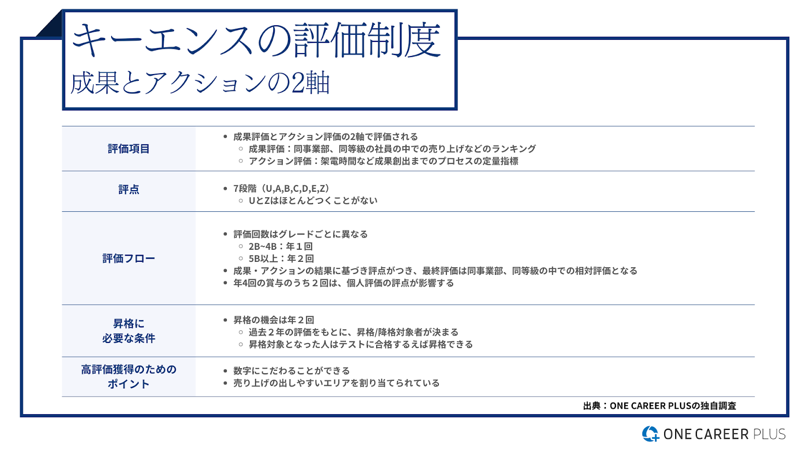 キーエンスの評価回数は社員のグレードによって異なります。2Bから4Bのグレードでは年に1回の評価が行われ、5B以上のグレードでは年に2回の評価が実施されます。評価項目は「成果評価」と「アクション評価」の大きく二つに分かれています。