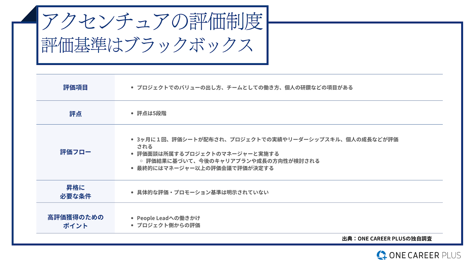 アクセンチュアの評価は、複数の項目をもとに行われます。評価項目は「プロジェクトでのバリューの出し方」「個人の研鑽」「チームとしての働き方」など分かれ、それぞれについて、5段階が行われます。会議に参加するのは、マネージャー以上のポジションで評価基準やフローは非公開です。