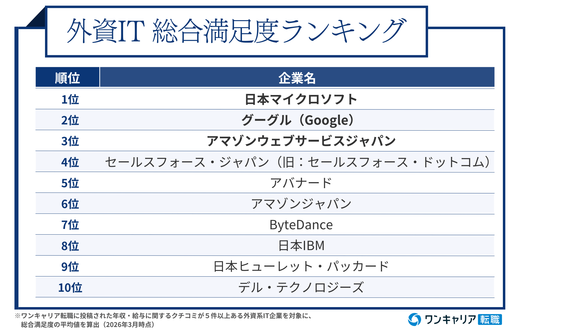 2026年3月現在、ワンキャリア転職に集まる外資IT企業の総合満足度ランキングは、以下の通りです。