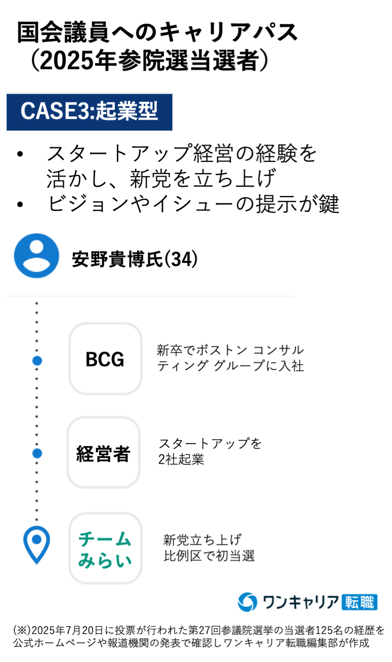 今回の参院選だと「チームみらい」が当てはまる。党首の安野貴博氏は東京大学工学部を卒業後にボストン コンサルティング グループで働き、AIチャットボットの株式会社BEDOREの創業などを経て政界入りした。従来の政治家像とは大きく異なる、テクノロジー業界出身の新しいタイプの政治家といえる。