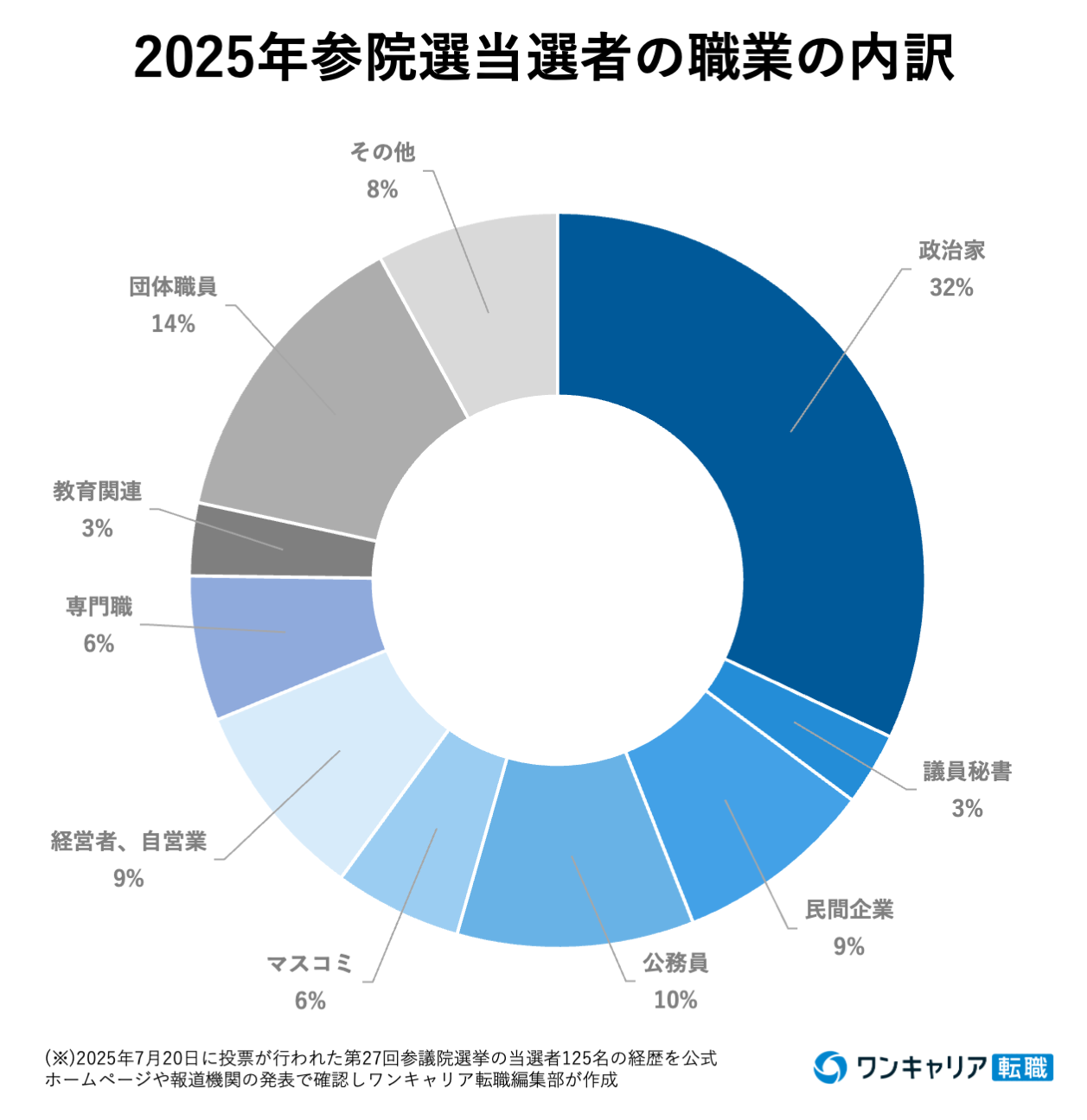 まずは、2025年参院選当選者の前職を調べてみた。最も多いのは「政治家」で40名(32%)を占める。次いで業界団体や労働組合などの「団体職員」が17名(14%)、「公務員」が13名(10%)と続く。