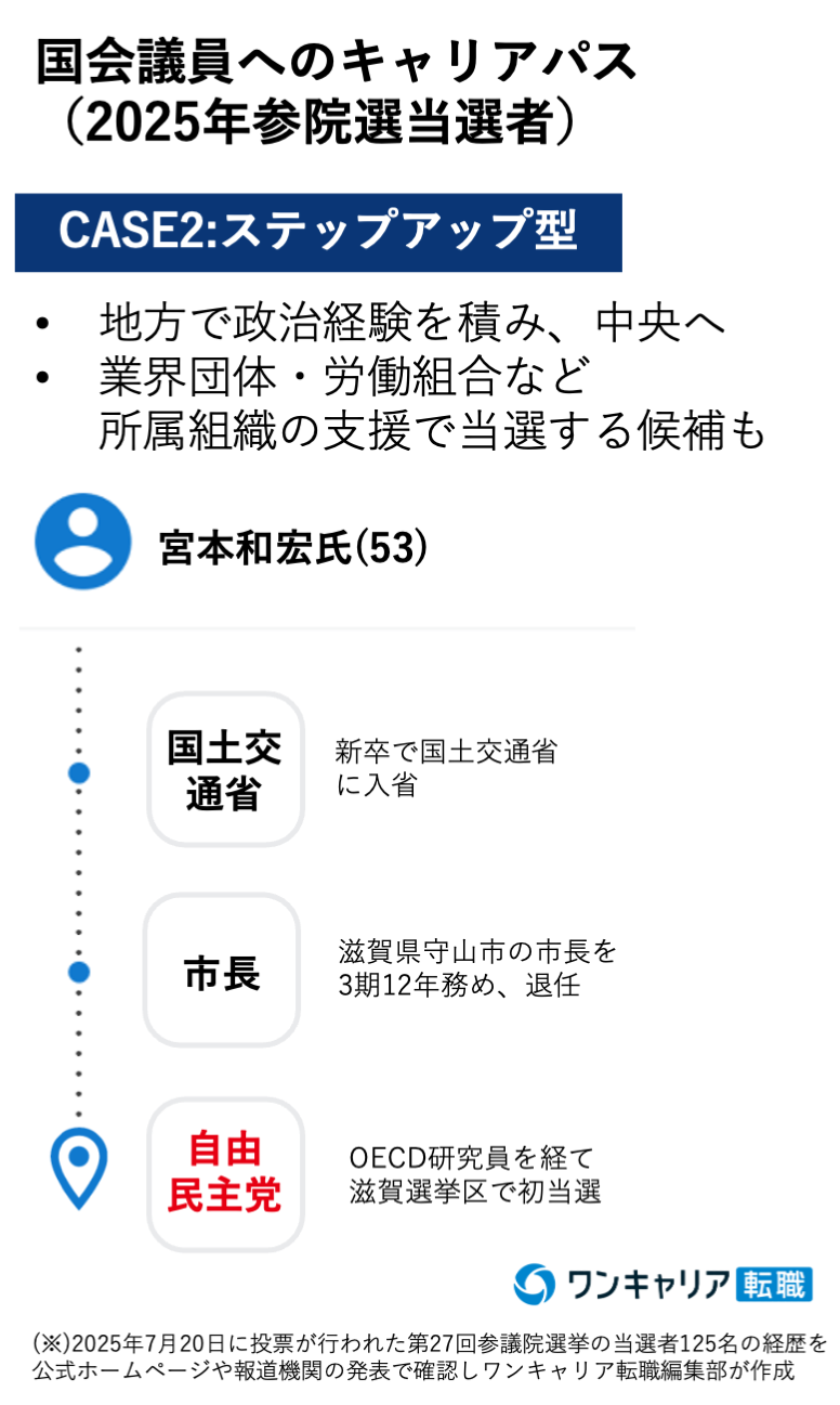 国会議員になるために確立されたステップを1つずつ着実に上っていくパターンで、転職に例えるなら「同業界でのキャリアアップ」といったイメージだろうか。