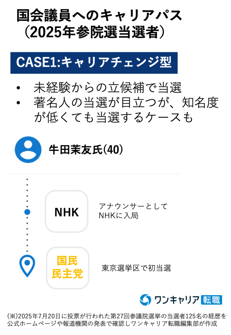 政治経験がない人が選挙に挑戦するパターンで、転職に例えるなら「未経験からのキャリアチェンジ」といえる。