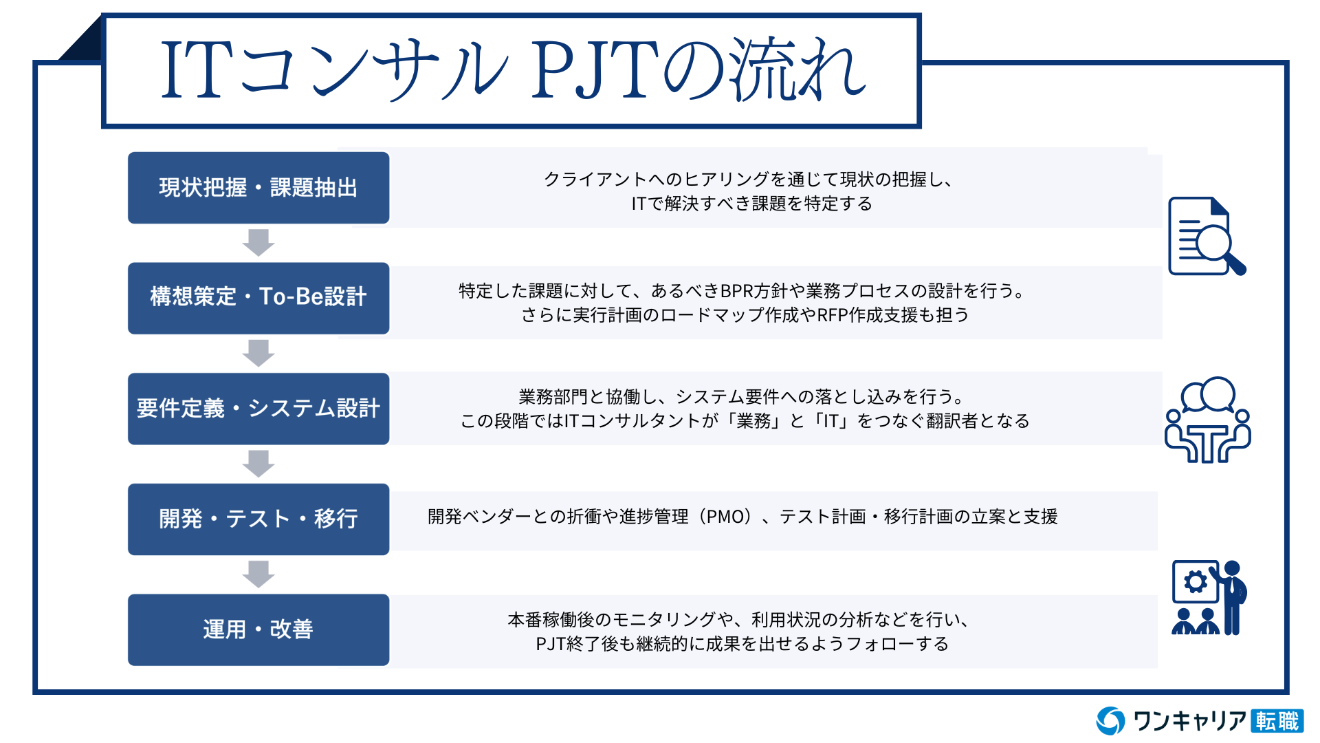 ITコンサルタントの役割は、アサインされるプロジェクトによって多様ですが、代表的なものは以下のような業務があります。