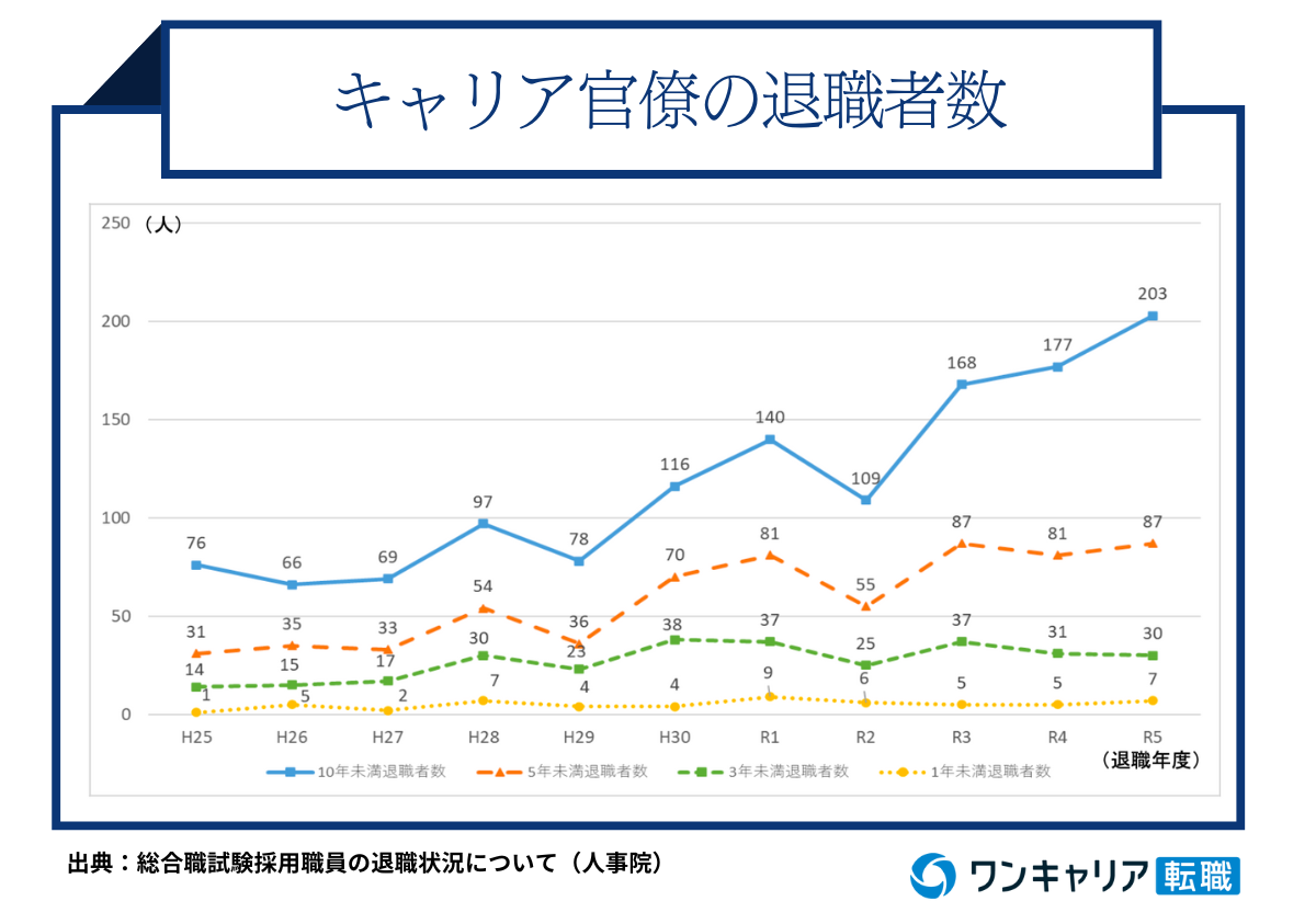 しかし、待遇改善が進む一方で、若手官僚の退職は増加傾向にある。人事院の調査によると、2023年度に退職した在職10年未満のキャリア官僚は203人。この10年で3倍近くまで増えており、20代〜30代の離職が顕著になってきている。